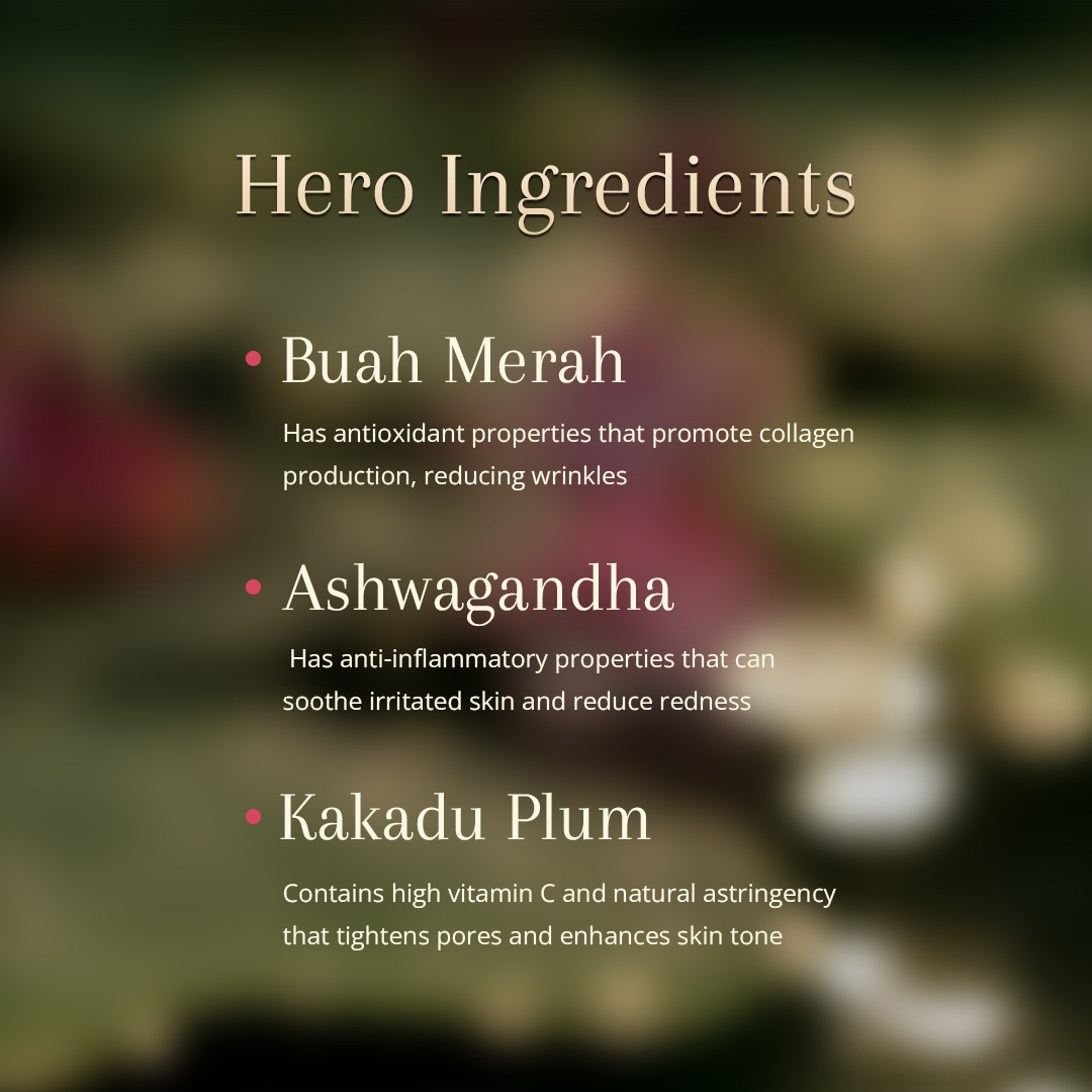 Distilled water, Safflower, Nano ZnO, Mango Butter, Montanov 202, Glycerin, Ashwagandha, Nano Extract, Buah Merah, Jojoba Oil, Licorice Nano Extract, Calendula Nano Extract, Montanov 68, Nano Tio2, Cetyl Alcohol, Kokum Butter, Kakadu Plum Nano Extract, NanoPearl, Sodium Levulinate, Sodium Anisate, Rose Essential, Orange Essential Oil, Vanilla Essential Oil, Tocopherol, Gum solagum ax, Dermofee ipa3.