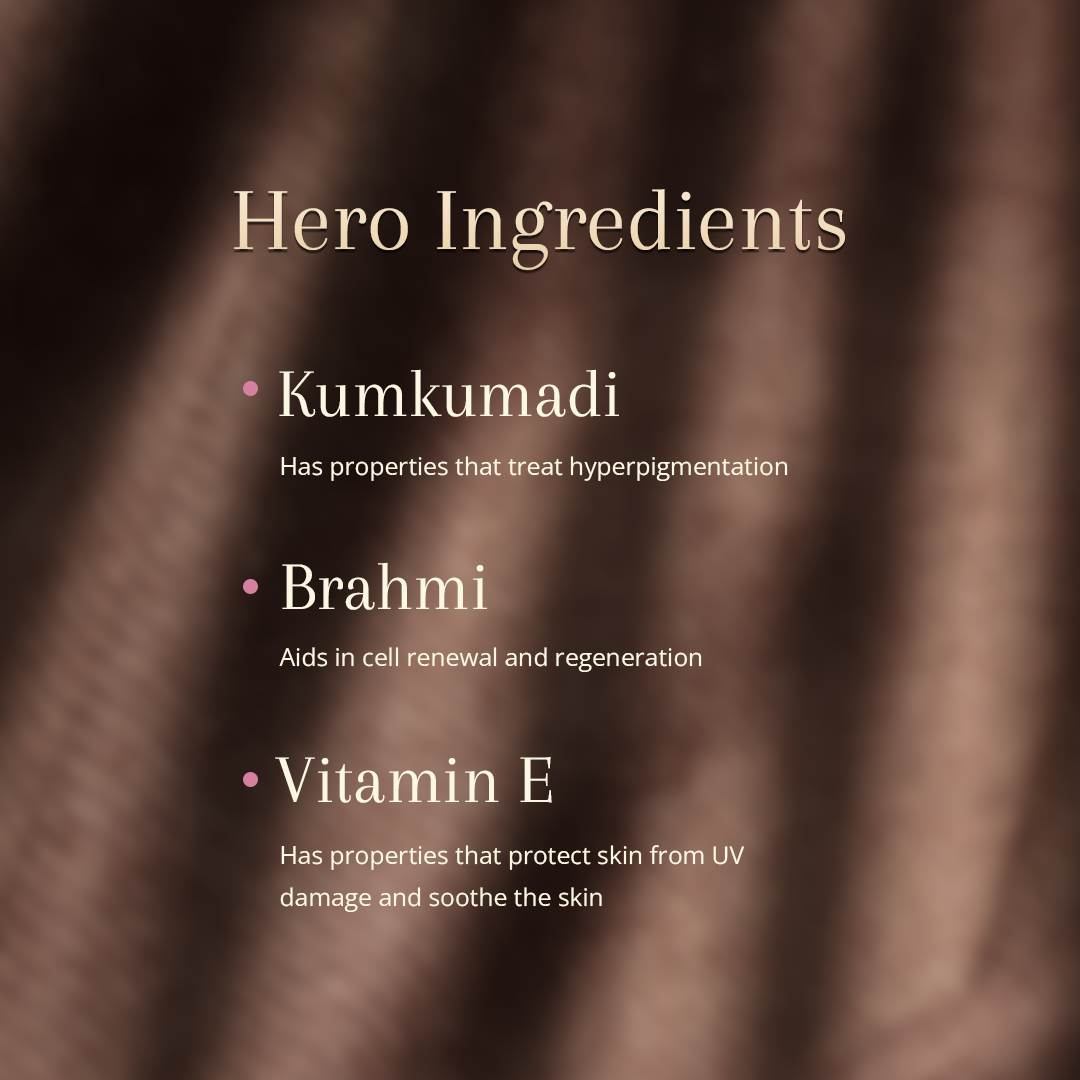 Isopropyl Myristate, Helianthus Annuus Seed Oil, Prunus Amygdalus Dulcis Oil,Bacopa Monnieri Oil, Vitamin E, Crocus Sativus Flower Extract, Kumkumadi Oil,Tocopherol.